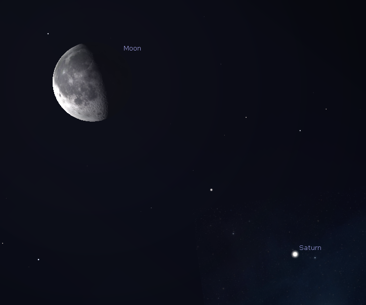 What Saturn and its moons might appear like in a telescope at 6 a.m., March 12, 2015. Small telescopes will show only the moon Titan. Created using Cartes du Ceil (Sky Charts).