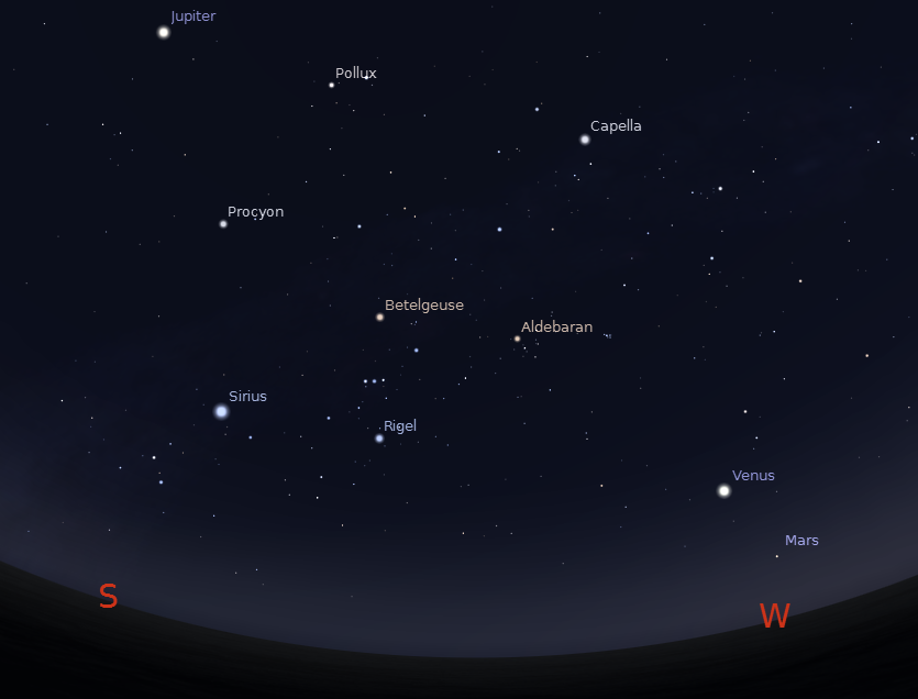 Lets take a look at the bright planets for this week. Brilliant Venus is in the west by 8:30 p.m. It will set at 10:49 p.m. Mars appears below and right of it. The Red Planet will set tonight at 9:47. Jupiter will appear In the southeastern sky in the evening. It will set at 6:41 a.m. It’s near the sickle-shaped head of Leo the lion, and it’s the brightest star-like object in the sky after Venus sets. In telescopes tonight the moon Io will duck behind Jupiter at 11:17, but will pop into sunlight a bit away from the planet on the other side at 2:28 a.m. because it also will be hidden in Jupiter’s shadow. Early risers will be able to spot Saturn which will rise in the east-southeast at 1:27 a.m. It will be low in the south at 6 to 7 a.m.