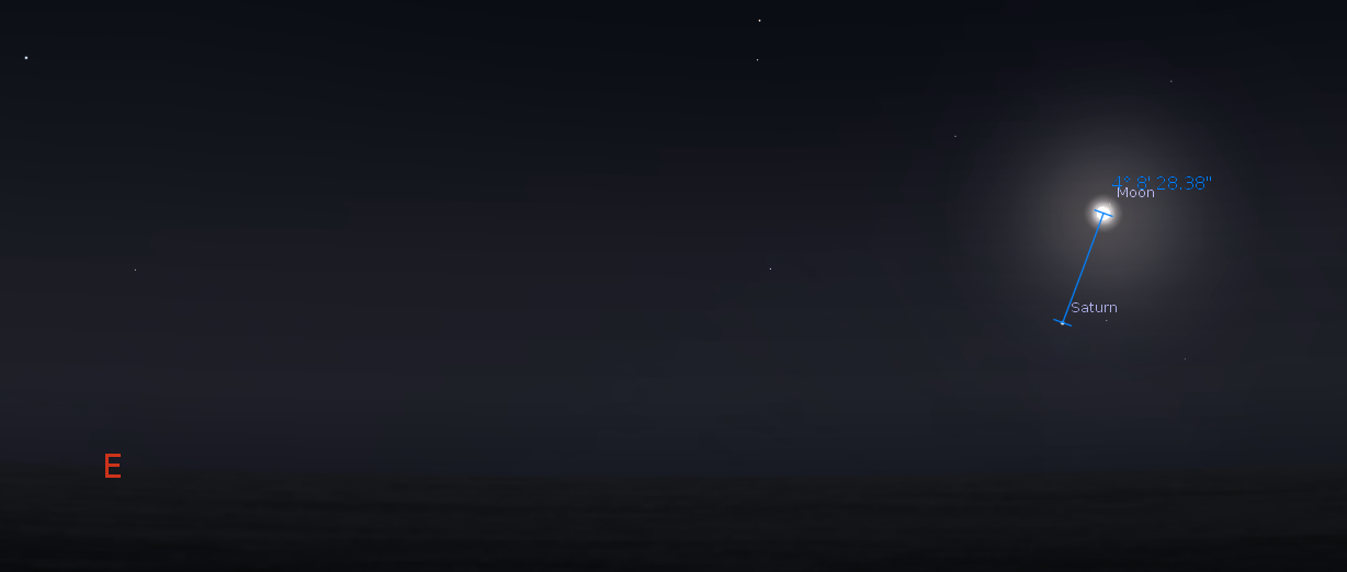 Saturn and the Moon shortly after twilight starts. 5:30 a.m., April 8, 2015. Created using Stellarium.