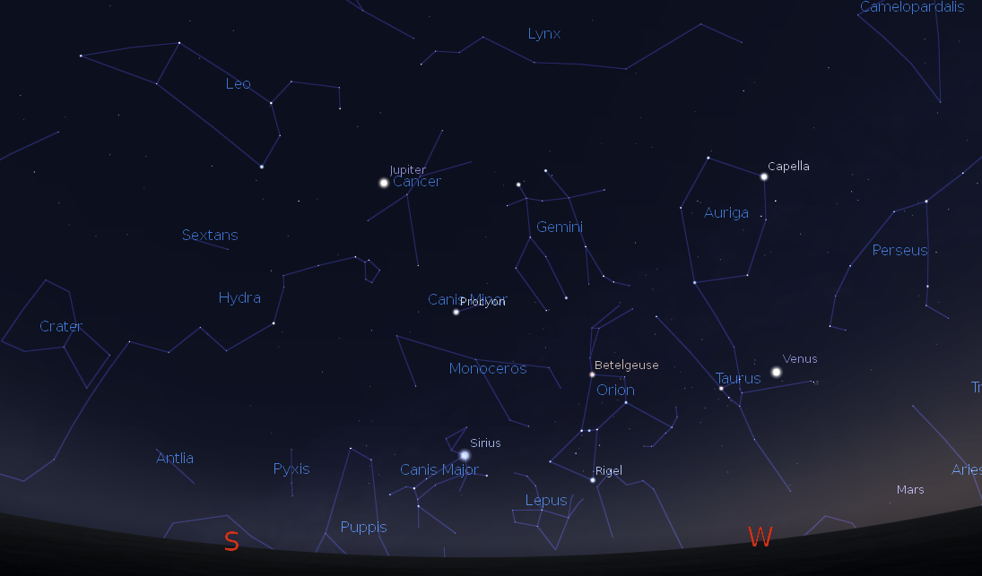 Jupiter, Venus and Mars and remaining winter constellations at 9:30 p.m. April 15, 2015. Created using Stellarium.