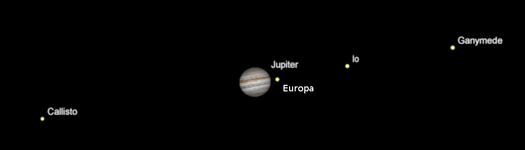 Jupiter and moons as they would appear in a telescope at 9:30 p.m. April 15, 2015. Created using Cartes du Ceil (Sky Charts).