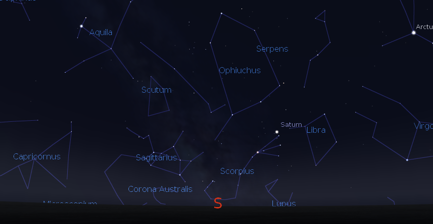 What Saturn and its moons might appear like in a telescope at 5:30 a.m., April 16, 2015. Small telescopes will show only the moon Titan. Created using Cartes du Ceil (Sky Charts).