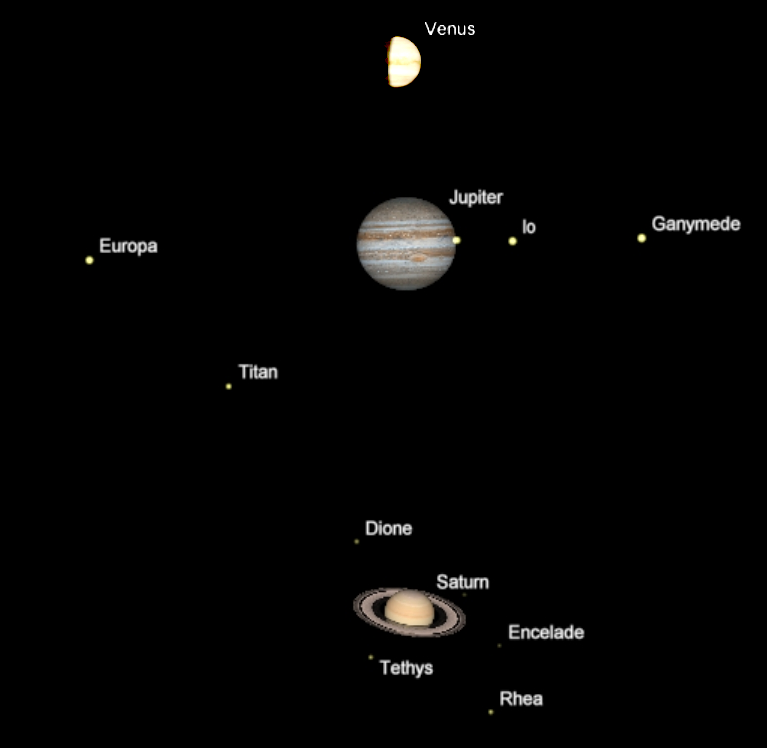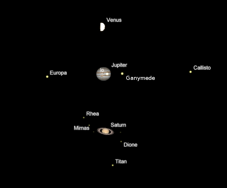 Apparent sizes of the planets Venus, Jupiter and Saturn compared for 10:30 p.m. on May 27, 2015. Created using Cartes du Ceil (Sky Charts).