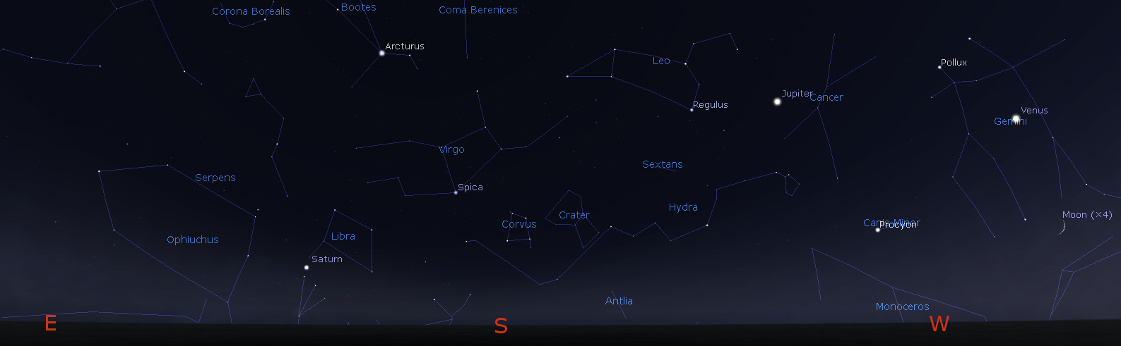 The evening planets and the Moon from west to east at 10:30 p.m. on May 27, 2015. Created using Stellarium.