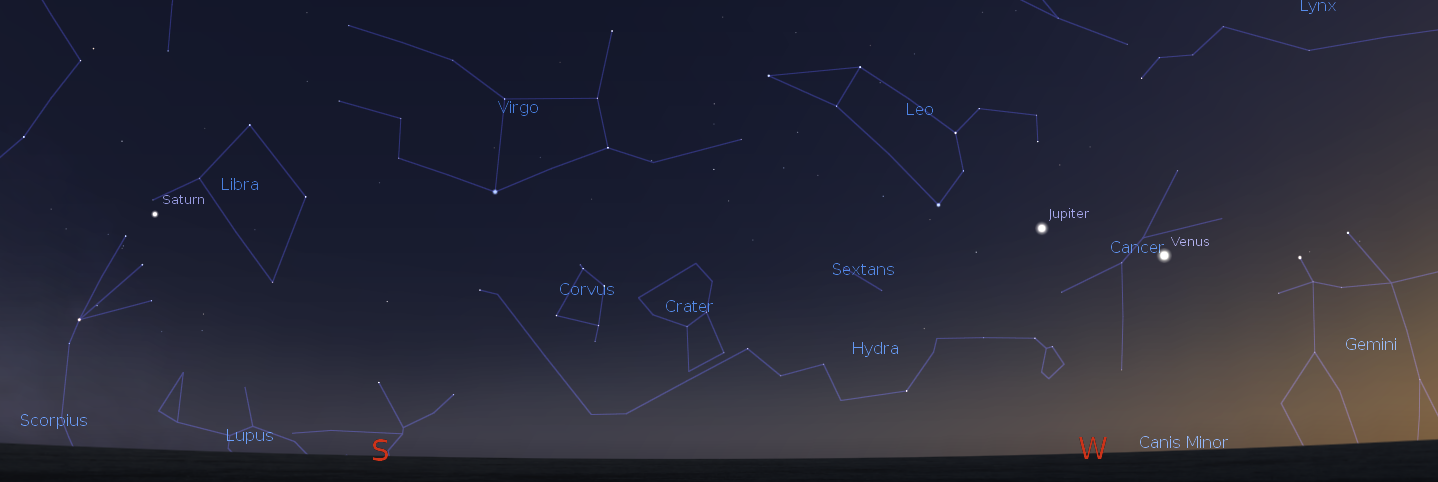 Lets take a look at the bright planets for this week. Our brilliant evening star Venus is in the west by 9:45 p.m. It will set at 12:31 a.m. Venus reached its greatest eastern elongation or separation from the Sun last Saturday it is now setting earlier. Venus’ slide down to the Sun will be much faster than its climb to greatest elongation. It will take a bit more than 2 months. Jupiter will appear western sky to the left of and slightly above Venus at about 10 p.m. It will set at 12:59 a.m. It seems to approach Venus. Now it appears about 13 degrees away. That’s somewhat more than the width of your fist held at arm’s length. They will cross paths on the 30th. Saturn is in the southeast as evening twilight fades.