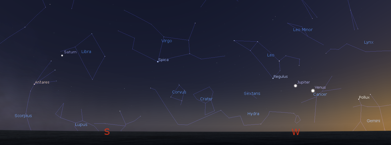 Lets take a look at the bright planets for this week. Our brilliant evening star Venus is in the west by 9:45 p.m. It will set at 12:19 a.m. Venus’ will slide down to the Sun faster and faster in the coming weeks. It will take a bit less than 2 months. Jupiter will appear western sky to the left of and slightly above Venus at about 10 p.m. It will set at 12:34 a.m. It seems to approach Venus, and now appears about 8 degrees away. That’s somewhat less than the width of your fist held at arm’s length. They will cross paths in 13 days, on the 30th. Saturn is in the southeast in evening twilight. It will pass due south at 11:51 p.m. and will set at 4:39 a.m. Check out Saturn’s rings in any small telescope.