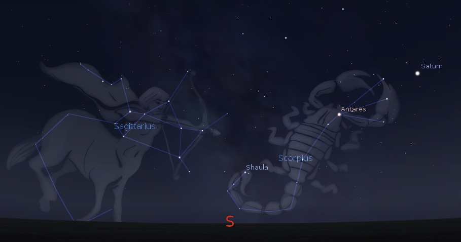 The Milky Way runs from north to south through the heavens at 11 p.m. You’ll notice that the Milky Way is brighter and broader just above the horizon in the south. In that glow in the south is a star pattern that looks like the stout little teapot of the children’s song, with a the Milky way like steam rising from the spout, which faces the west. This pattern of stars is the major part of the constellation called Sagittarius. According to Greek mythology Sagittarius is a centaur with a bow and arrow poised to shoot Scorpius the scorpion to the right. This centaur is called Chiron, the most learned of the breed, centaurs usually being a rowdy bunch. The center of the pin wheel of our galaxy lies hidden beyond the stars above the spout of the teapot.