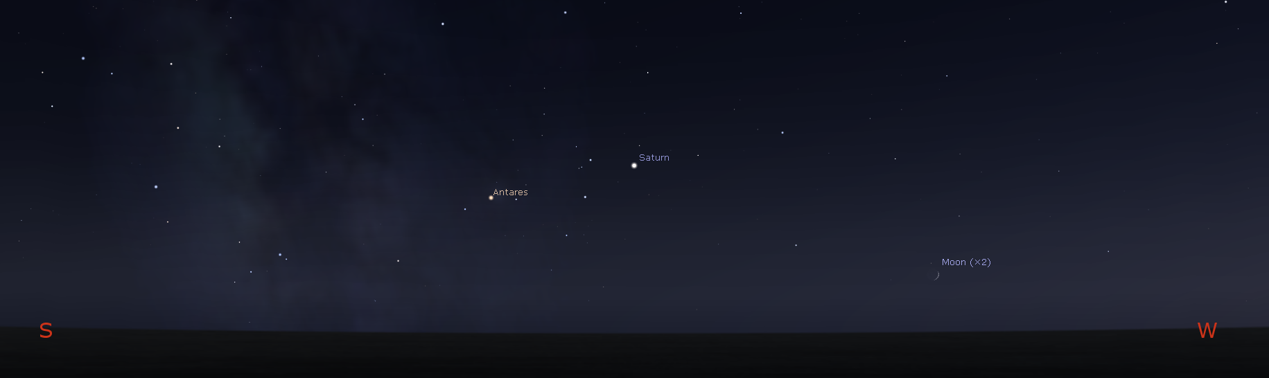 Lets look for the bright planets for this week. Saturn is alone in the evening sky spotted by 9 p.m. low in the southwestern sky near the bright star Antares to its left. Antares has a reddish hue, while Saturn is brighter and yellowish. Both these colors are enhanced by being low to the horizon. Saturn will set at 10:39 p.m. The rest of the planet action has moved to the morning sky. Venus, the morning star, will rise at 4:42 a.m. a bit north of east. Much dimmer Mars will rise at 4:48 a.m. in the east-northeast. Jupiter is beginning to be visible in the morning sky and will rise at 5:57, almost an hour before the Sun. Mercury, though in the evening sky, sets too soon after the Sun to be visible.