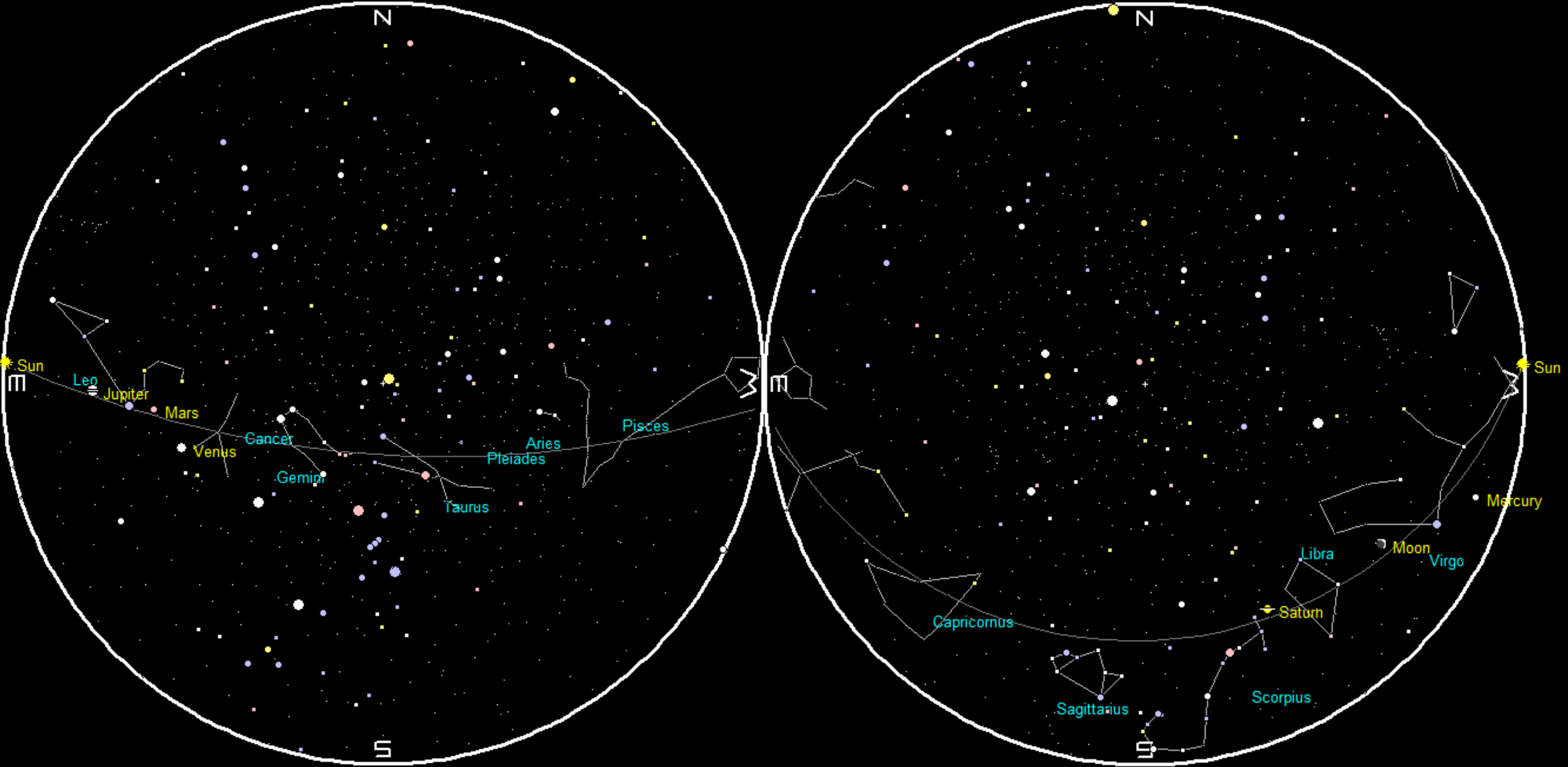 This is a chart showing the sunrise and sunset skies for September 16, 2015 showing the location of the planets and the Moon at that time. Created using my LookingUp program. Click on the image to enlarge.