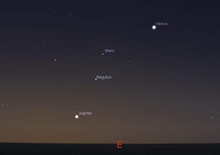 Venus, Mars and Jupiter with the star Regulus in morning twilight at 6:30 a.m. September 17, 2015. Created using Stellarium.