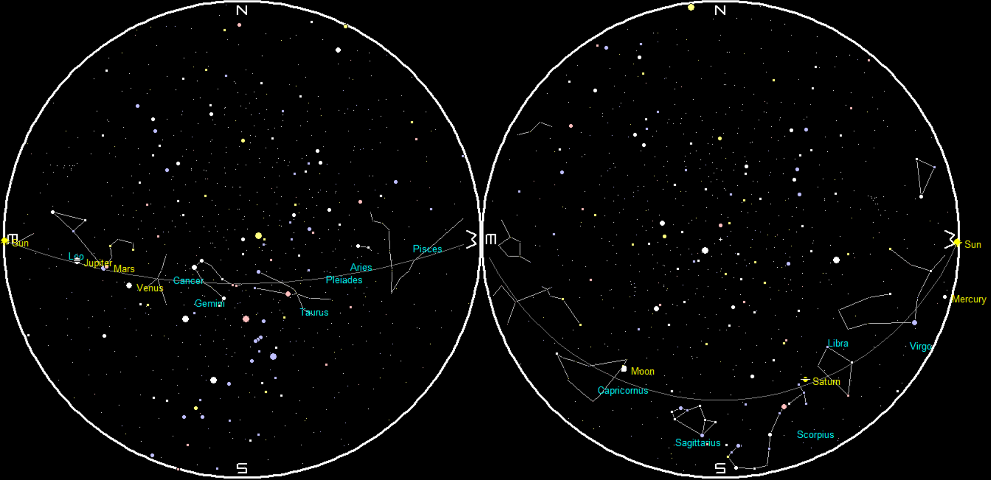 Saturn and the Moon with setting southern summer stars at 8:30 p.m. on September 23, 2015. The Moon is shown twice actual size. Created using Stellarium.