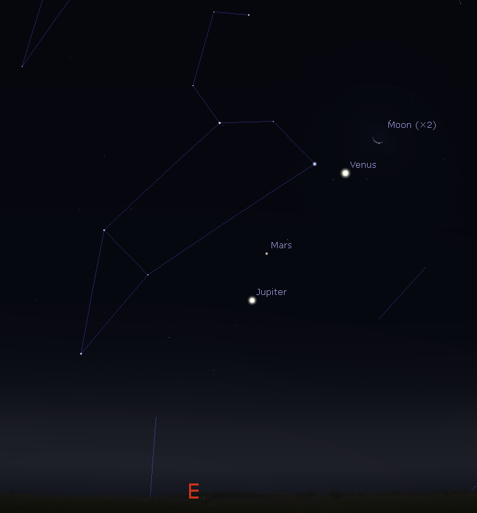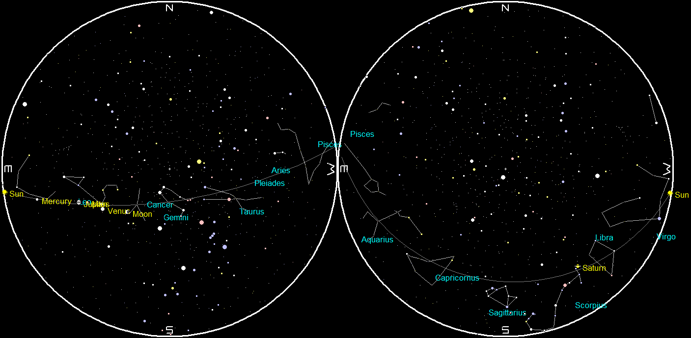 Lets see what’s happening with the bright planets. Saturn is alone in the evening sky spotted by 8:30 p.m. low in the southwestern sky near the bright star Antares to its left. Antares has a reddish hue, while Saturn is brighter and yellowish. Both these colors are enhanced by being low to the horizon. Saturn will set at 9:22 p.m. The rest of the planet action in the morning sky is getting interesting. Brilliant Venus, the morning star, will rise at 3:58 a.m. a bit north of east. Tomorrow it will be at its greatest separation from the sun and start to fall back. The Moon will be near Venus tomorrow morning. The star Regulus is near Venus. Much dimmer Mars, brighter Jupiter and finally Mercury will rise at 4:35, 4:57 and 6:37 respectively.