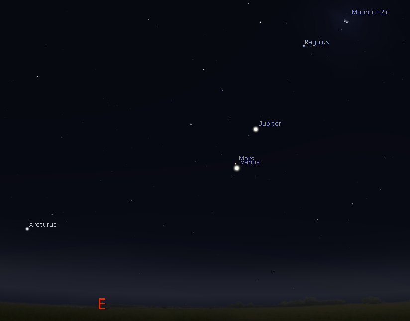 Let’s check out the whereabouts of the bright naked eye planets. The numbers of visible planets is getting a bit thin. The planet Saturn will be low in the west-southwest after sunset and will set at 6:41 p.m. It would be as hard to find as Mercury would be at its best in the evening sky. And Mercury itself is too close to the direction of the Sun to be spotted. However in the morning sky there are three bright planets. Jupiter will be the first to rise, at 2:34 a.m. in the east-northeast. Mars and Venus will rise within 5 minutes of each outer by 3:20 a.m. Mars will be almost directly above Venus by a degree or two Moon diameters. Friday and Saturday mornings the Moon will appear near these planets.