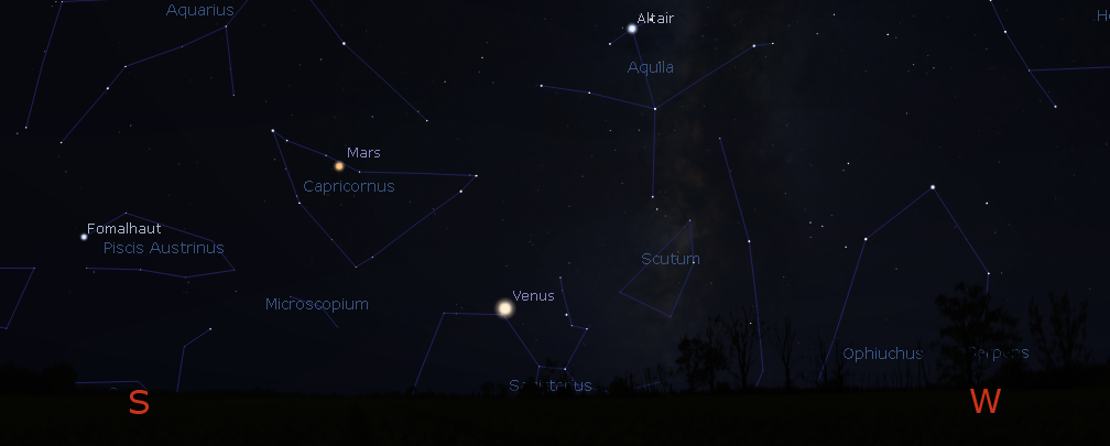 Venus, Mars and the constellation Capricornus at 6:30 p.m., November 23, 2016. Created using Stellarium.