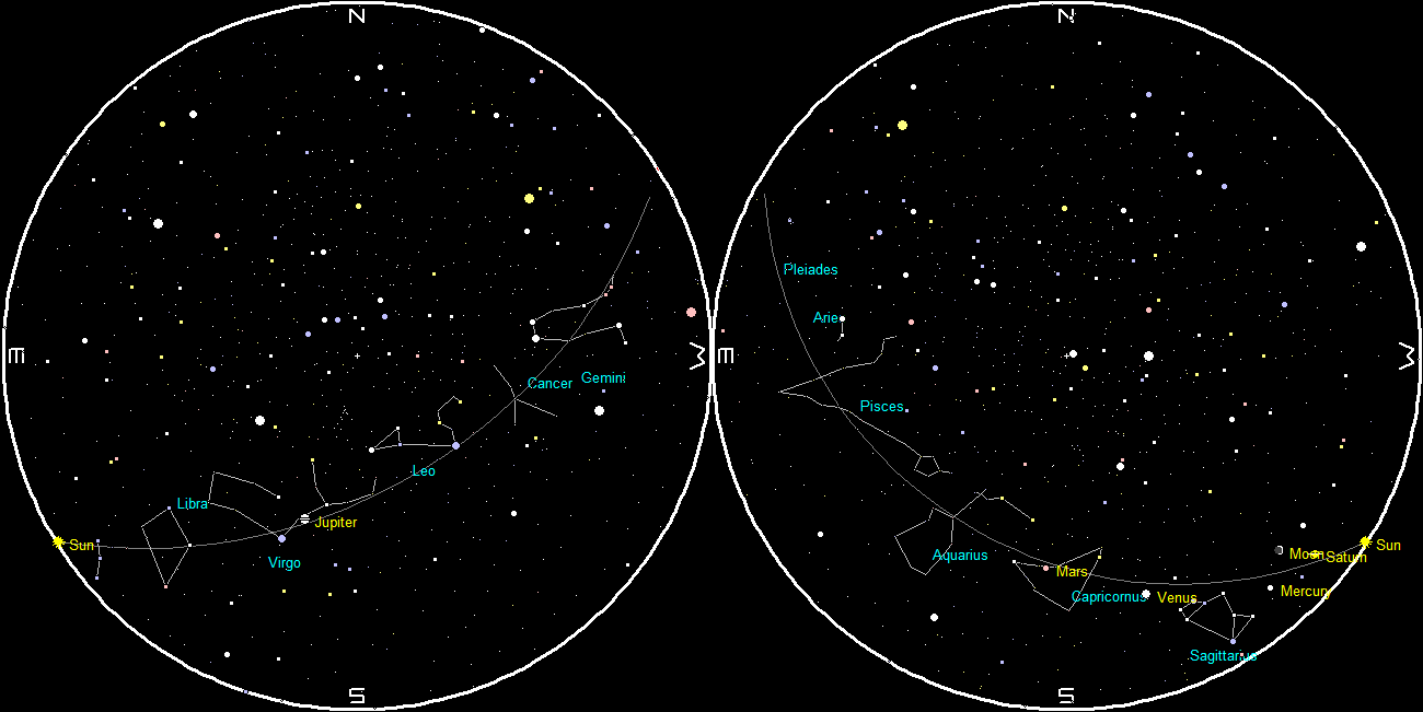 In the east-southeast before 7:30 these mornings. Jupiter can be glimpsed in the morning twilight. Jupiter will rise tomorrow at 3:44 a.m. We are approaching Jupiter as it appears to move away from the Sun. We will pass it on April 7th next year. Venus and Mars are in the evening sky. At 6 p.m. these planets will be seen in the southwest and low in the sky. Venus will be the lower and brighter of the two, Mars will be higher to the left. Venus will set at 7:45. Mars will hang on a bit longer and will set at 10:08. Mars’ setting time hasn’t changed much in the last month. It’s losing to the Sun by only a little bit each day. Venus is slowly heading northward for the rest of it’s evening appearance, and will be moving higher in the sky.
