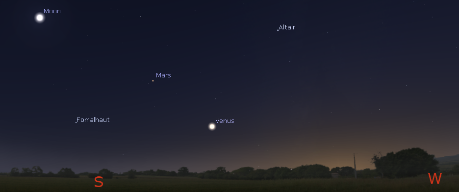 Venus, Mars and the Moon at 6 p.m., December 7, 2016. This is approximately one hour after sunset. Click on image to enlarge. Created using Stellarium.