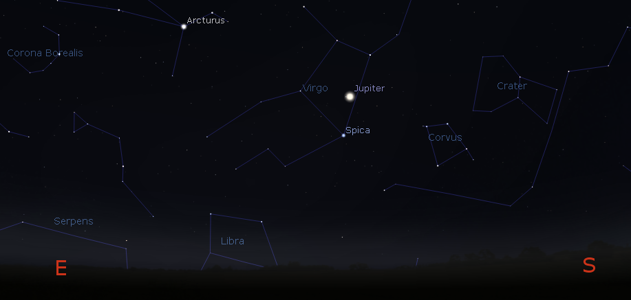 Jupiter and a preview of spring constellations at 6:30 a.m. December 8, 2016. Click on image to enlarge. Created using Stellarium.