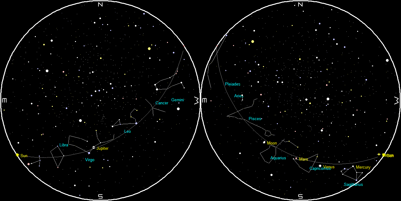 In the east-southeast before 7:30 these mornings. Jupiter can be glimpsed in the morning twilight. Jupiter will rise tomorrow at 3:01 a.m. We are approaching Jupiter as it appears to move away from the Sun. We will pass it on April 7th next year. Venus and Mars are in the evening sky. At 6 p.m. these planets will be seen in the southwest and low in the sky. Venus will be the lower and brighter of the two, Mars will be higher to the left. Venus will set at 8:14. Mars will hang on a bit longer and will set at 10:10. Mars’ setting time hasn’t changed much in the last month and a half. It’s losing to the Sun by only a little bit each day. Venus is slowly heading northward for the rest of it’s evening appearance, and is moving higher in the sky.