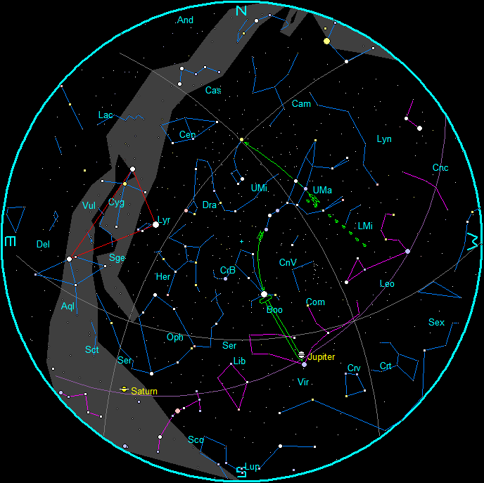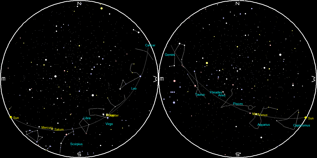 The planets and stars are plotted for the 15th at 9 p.m. EST, and again at 6 a.m. Those are chart times. Note, Traverse City is located approximately 45 minutes behind our time meridian. (An hour 45 minutes behind our daylight saving time meridian. during EDT and 45 minutes behind our daylight standard time meridian. during EST). To duplicate the star positions on a planisphere you may have to set it to 1:45 or 0:45 earlier than the current time if you were near your time meridian.