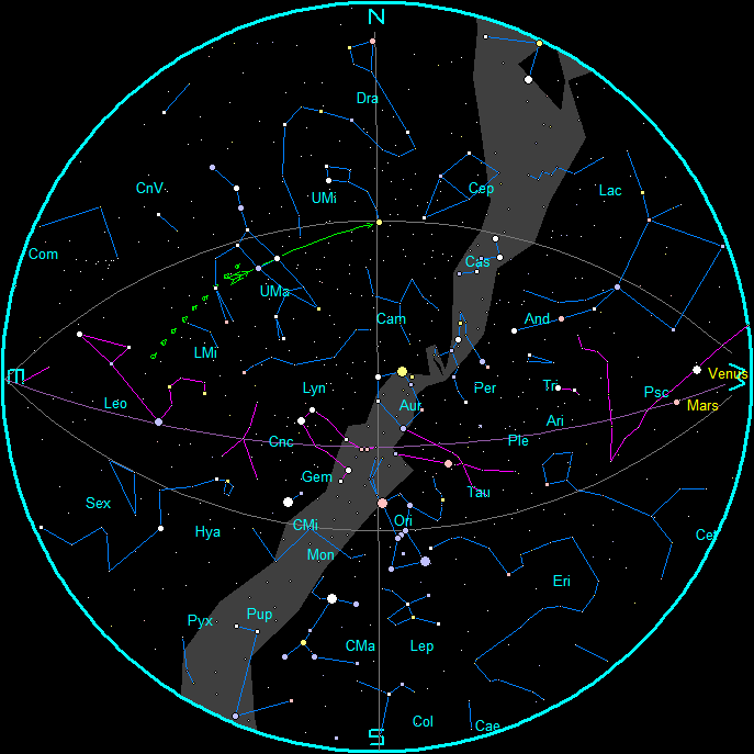 In the chart above the comet’s position is marked by a comet symbol. The comet’s tail, if visible at all, will actually point to the right along its track. The data for this chart is taken from Seiichi Yoshida’s Weekly Information about Bright Comets: http://www.aerith.net/comet/weekly/current.html