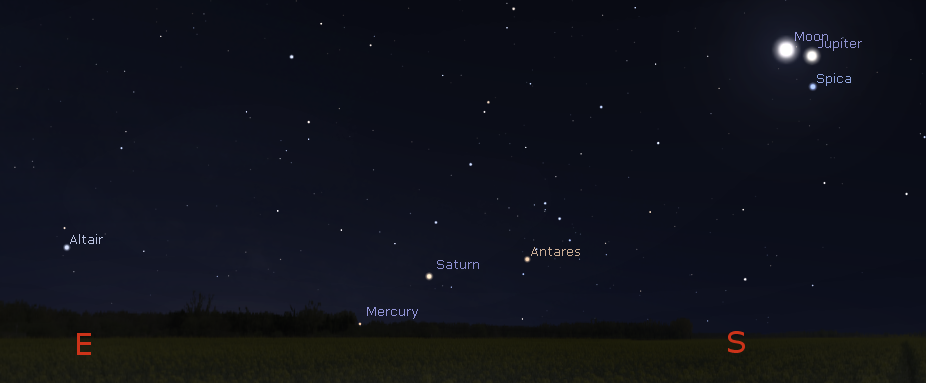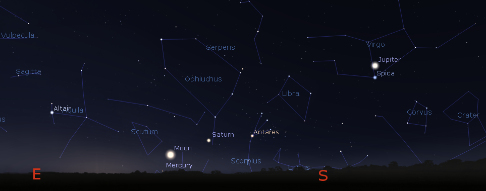 The Moon and Jupiter in the south above the star Spica with Saturn and Mercury peeking over the horizon in the southeast at 7 a.m. tomorrow morning, January 19, 2017. Created using Stellarium. Click image to enlarge.