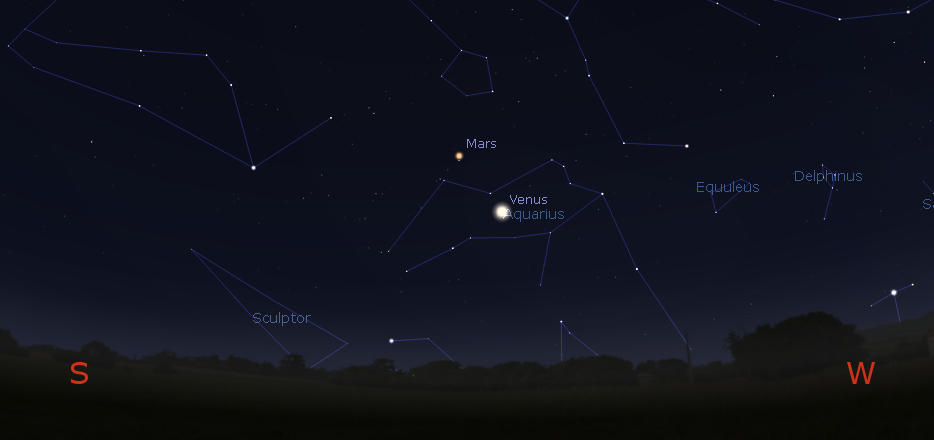 Venus, and Mars in the evening twilight of about an hour and three-quarters after sunset. 7 p.m. January 11, 2017. The Moon is out of the frame in the east. Created using Stellarium.