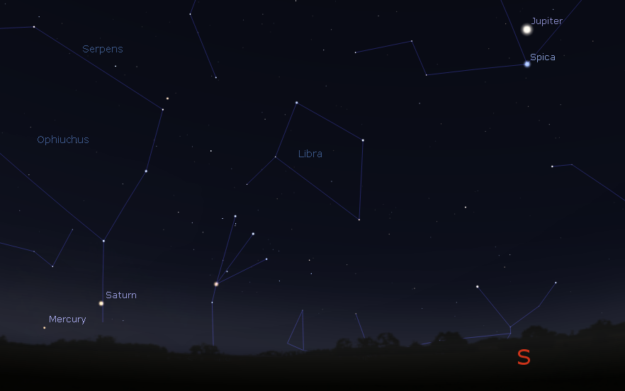 Jupiter in the south above the star Spica with Saturn and Mercury peeking over the horizon in the southeast at 7 a.m. this morning, January 11, 2017. Created using Stellarium.