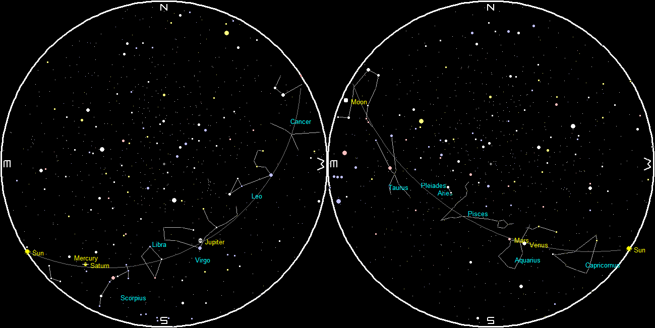 Let’s check out the bright planets for this week. Saturn can be glimpsed now in the morning, rising at 6:13 in the east-southeast. Mercury is following Saturn and very hard to spot, rising at 6:40 this morning. Jupiter can be glimpsed even as the sky brightens at 7 a.m. this morning when it’s in the south above the star Spica in Virgo. Jupiter will rise tomorrow at 1:05 a.m. Venus and Mars are in the evening sky. At 6:30 p.m. these planets will be seen in the southwestern sky. Venus is unmistakable as the brilliant evening star, Mars will be above and left of it and much dimmer and will set at 10:13.. Venus itself will set at 9:28 p.m. Venus is slowly heading northward for the rest of it’s evening appearance, and is moving higher in the sky, and will reach its greatest eastern elongation or separation from the Sun tomorrow.