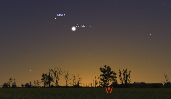 Venus and Mars in the evening twilight of about an hour after sunset. 7 p.m. February 15, 2017. Venus is now drawing away from Mars as it heads toward the Sun faster than Mars. Their apparent paths won’t cross again until October in the morning sky. Created using Stellarium.