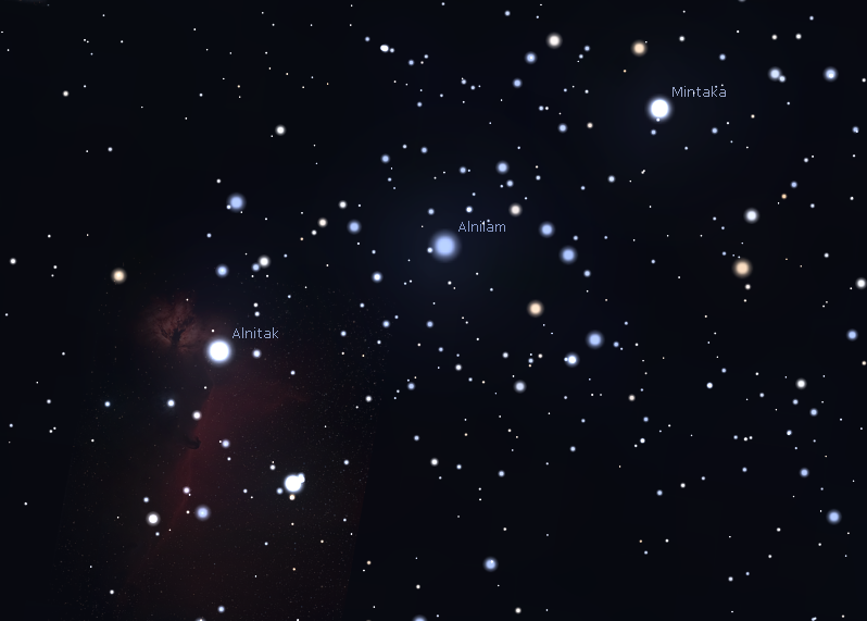 Orion’s belt stars showing the nebulae illuminated by Alnitak. The Flame Nebula above left of it and the Horsehead Nebula below. At this scale the horse’s head figure appears as a dark bump into the left edge of the red glow.