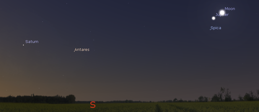 Jupiter in the south above the star Spica and the waning gibbous Moon to the right with Saturn in the southeast at 7 a.m. this morning, February 15, 2017. Created using Stellarium.
