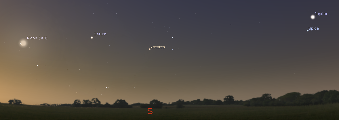 Jupiter in the south above the star Spica with Saturn in the southeast and the crescent Moon further to the left at 7 a.m. this morning, February 22, 2017. Created using Stellarium.