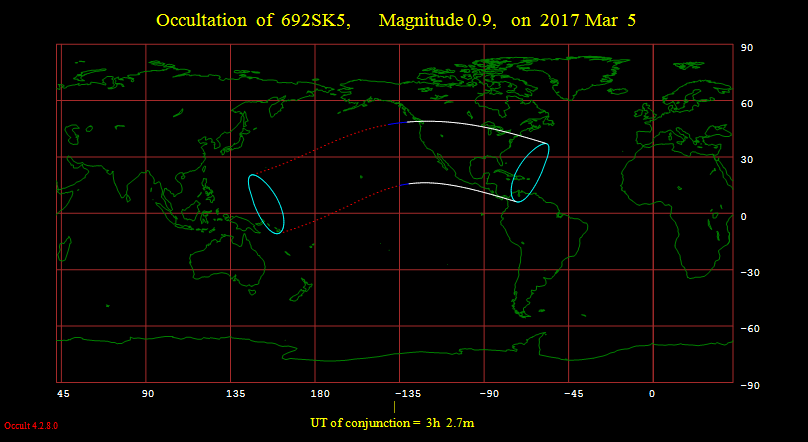 Path of the occultation of Aldebaran for March 4-5, 2017. Note where the top edge of the path goes. Right through northern Michigan.