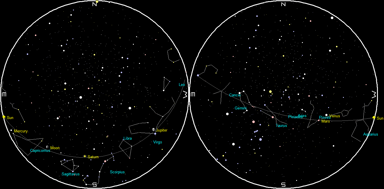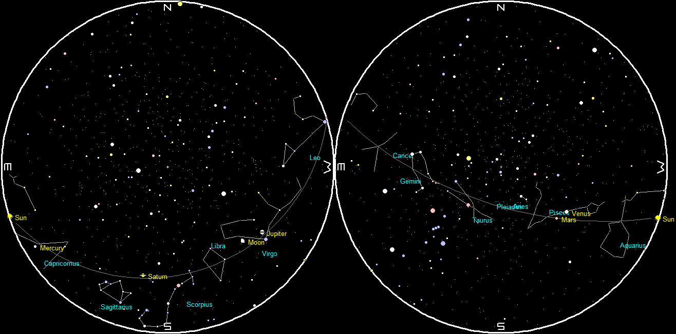 The planets and stars are plotted for the 15th at 10 p.m. EDT, and again at 6 a.m. Those are chart times. Note, Traverse City is located approximately 45 minutes behind our time meridian. (An hour 45 minutes behind our daylight saving time meridian. during EDT and 45 minutes behind our daylight standard time meridian. during EST). To duplicate the star positions on a planisphere you may have to set it to 1:45 or 0:45 earlier than the current time if you were near your time meridian.