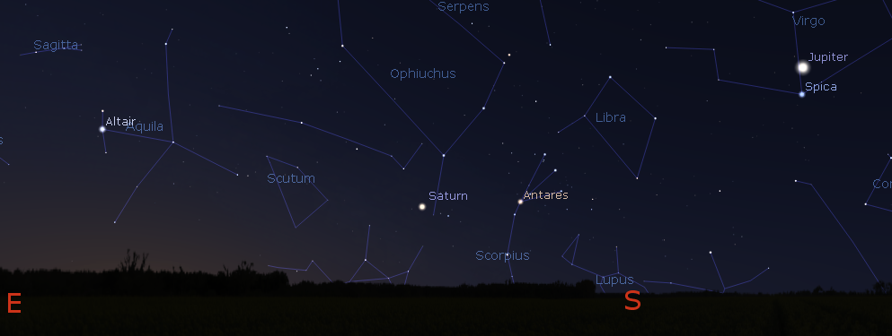 Jupiter in the south above the star Spica with Saturn the southeast at 7 a.m. this morning, February 2, 2017. Created using Stellarium.