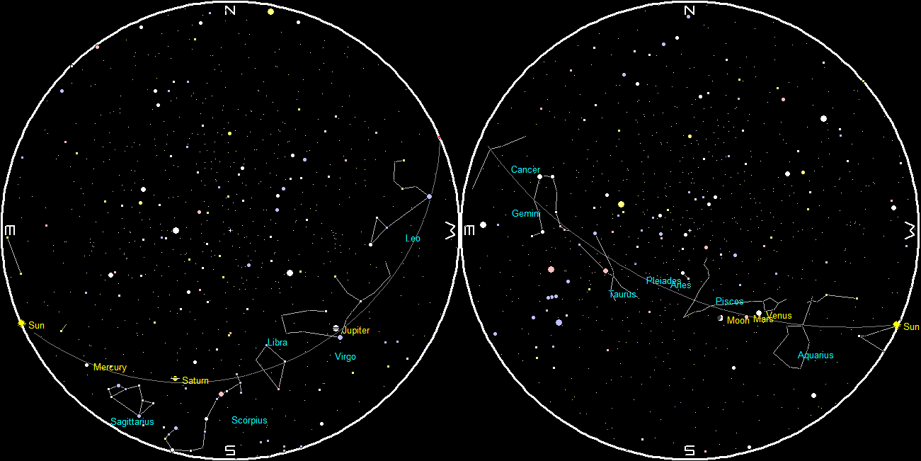Let’s check out the bright planets for this week. Saturn can be glimpsed this morning in the southeast at 7 a.m. It will rise tomorrow at 5 a.m. in the east-southeast. Jupiter can be seen in the south-southwest this morning above the star Spica in Virgo. Jupiter will rise tonight at 11:43 p.m. Venus and Mars are in the evening sky. At 7 p.m. these planets will be seen in the southwestern sky. Venus is unmistakable as the brilliant evening star, Mars will be above and left of it and much dimmer, the Moon higher still and in line. Mars will set at 10:14. Venus itself will set at 9:52 p.m. Venus exhibits a dazzling fat crescent in small telescopes now, but a month from now as it gets closer to Earth the thinning crescent will be big enough to be seen in binoculars.