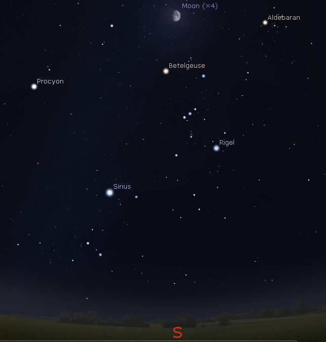 The Moon and the stars tonight at 9:21 p.m. Don’t be fooled by the size of the Moon. Here it appears 4 times its actual diameter, and 16 times its area in this image. It actually appears really small. But it will appear a lot bigger when it sets due to the horizon illusion. Created using Stellarium.