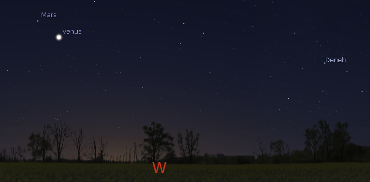 Venus and Mars in the evening twilight of about an hour after sunset. 7 p.m. February 8, 2017. Venus is now drawing away from Mars as it heads toward the Sun faster than Mars. Their apparent paths won’t cross again until October in the October sky. Created using Stellarium.