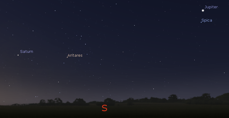Jupiter in the south above the star Spica with Saturn the southeast at 7 a.m. this morning, February 9, 2017. Created using Stellarium.