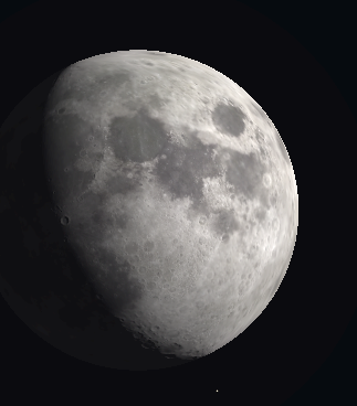 The Moon as it might be seen in binoculars at 9:30 p.m. April 5, 2016. Note the prominent crater Copernicus emerging into sunlight on the left of the Moon. Created using Stellarium.