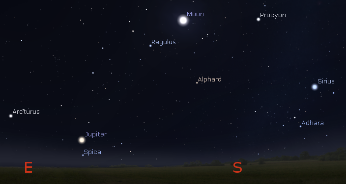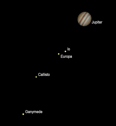 Jupiter and its moons as they might be seen in a telescope at 11 p.m. April 5, 2017. It is usually best to let planets rise a bit to minimize the atmospheric effects on the image. Created using Cartes du Ciel.