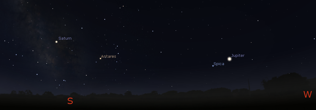 In the evening twilit sky tonight will feature the elusive planet Mercury. This tiny planet might be seen to the upper right of the Sun’s setting point starting about 9 p.m. It will set at 9:55 p.m. Mercury is getting rapidly fainter because it’s now exhibiting a diminishing crescent to us. It takes a good telescope and very steady skies to spot Mercury’s phase. Mars is still hanging on, in the west above and left of Mercury, and will set at 11:09 p.m. Jupiter will rise about sunset a half hour before the star Spica, which it will be seen to hang out with this year. Jupiter will be still seen in the morning sky low in the southwest at 6 a.m. Saturn then is in the south above the Teapot figure of Sagittarius. It will rise at 2:06 a.m. in the east-southeast.