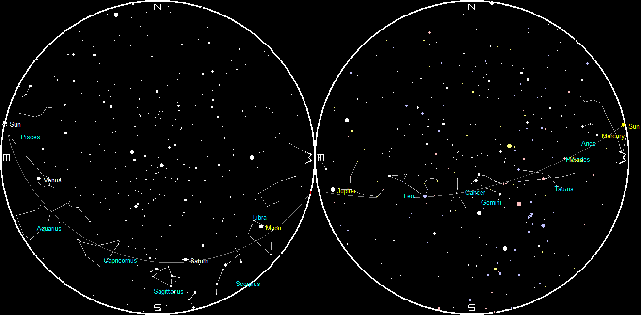 Planets and the Moon at sunset and sunrise of a single night starting with sunset on the right on April 12, 2017. The night ends on the left with sunrise on April 13. Click on the image to enlarge. Created using my LookingUp program.