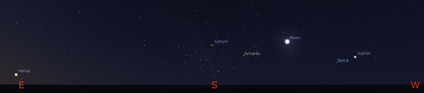 Jupiter, the Moon, Saturn and Venus at the eastern horizon at 6 a.m. April 13, 2017. Created using Stellarium.