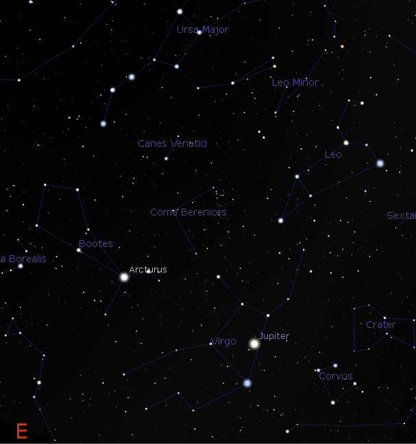 High in the east-southeast at 10 p.m. is the tiny and faint constellation of Coma Berenices, or Berenice’s Hair. In it are lots of faint stars that look like several strands of hair. The whole group will fit in the field of a pair of binoculars, which will also show many more stars. The star cluster is 280 light years away, nearly twice as far as the Hyades, the face of Taurus the Bull setting in the west. The story behind it was that Berenice was the Queen of Egypt, whose husband was away at war. She offered her golden tresses to the gods for the king’s safe return. The hair, was placed in a temple. However the offering disappeared when the king returned. Ever since the constellation of Coma Berenices has been seen to commemorate the queen’s sacrifice.