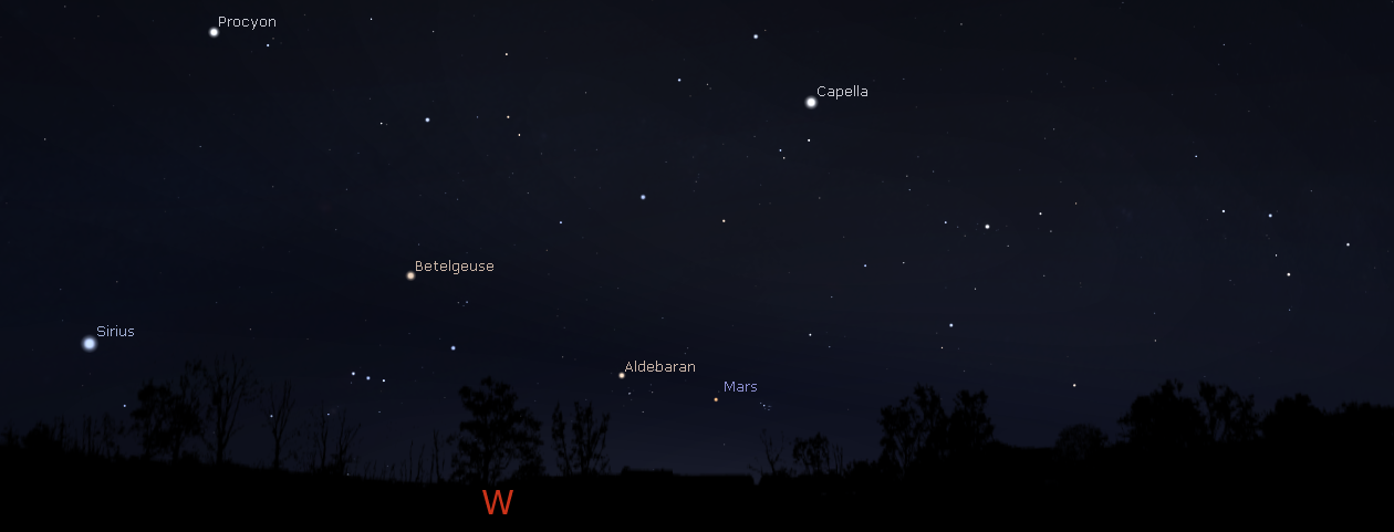 Mars in the west with bright stars at 10 p.m. April 26, 2017. Creating this image reminded me of the fantastic star party at the Sleeping Bear Dunes last Saturday, seeing over the large dune in the west to Sirius in the southwest to Cassiopeia in the northwest. Created using Stellarium.