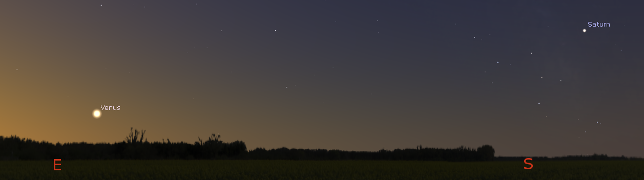 Let’s take our Wednesday weekly look at the bright planets. Mars is still in the west after sunset and fading. It’s near the Pleiades star cluster now. It will set at 11:04 p.m. Coming to dominate the evening sky low in the southeast in evening twilight is Jupiter. It’s seen above the bright blue-white star Spica in the early evening. In even the smallest telescopes Jupiter’s four largest moons can be seen. They shift positions night to night and even as you watch. Jupiter will set at 6:09 a.m. At 6 a.m. Saturn will appear to be a bit to the west of south compass point. It will rise in the east-southeast at 12:41 a.m. tomorrow. Venus will be low in the east at 6 a.m. tomorrow morning after rising at 5:06 a.m. It will appear as a tiny crescent moon in binoculars and telescopes.
