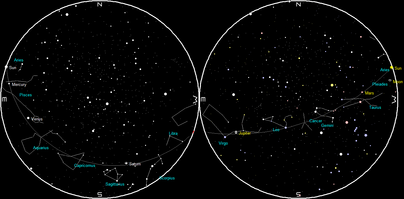 Planets and the Moon at sunset and sunrise of a single night starting with sunset on the right on April 26, 2017. The night ends on the left with sunrise on April 27. Click on the image to enlarge. Created using my LookingUp program.