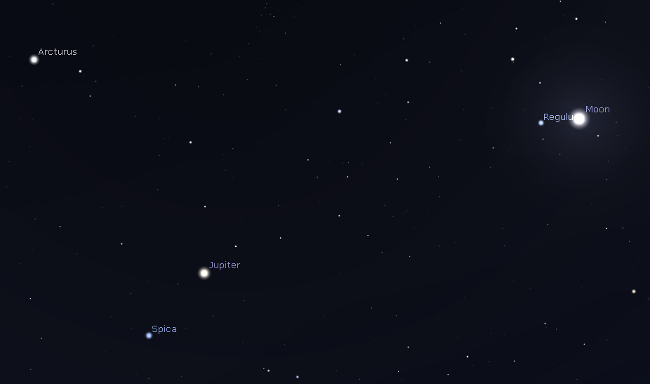 Jupiter above Spica and the Moon with the bright stars 10 p.m. May 3, 2017. Created using Stellarium.
