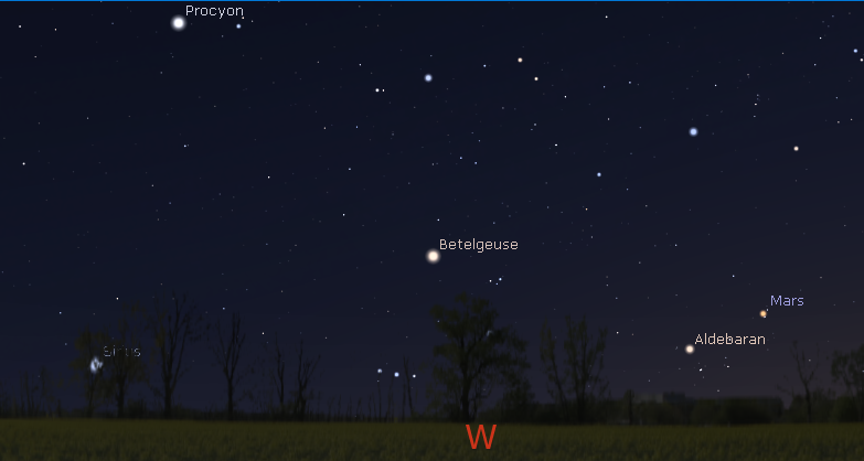 Let’s take our weekly look at the bright planets. Mars is still in the west after sunset and fading. It’s approaching the star Aldebaran in Taurus now. It will set at 11:01 p.m. Not quite dominating the evening sky now due to the Moon is Jupiter in the southeast. It’s seen above the bright blue-white star Spica. In even the smallest telescopes Jupiter’s four largest moons can be seen. They shift positions night to night and even as you watch. Tonight early in the evening all 4 bright moons can be seen, but the one closest to Jupiter will disappear behind the planet at 10:11 p.m. It will reappear on the other side at 12:48 a.m. Jupiter will set at 5:36 a.m. At 6 a.m. both Saturn and Venus will be in the morning twilight. At 6 a.m. Saturn will appear to be a bit to the west of south compass point. It will rise in the east-southeast at 12:13 a.m. tomorrow. Venus will be low in the east at 6 a.m. tomorrow morning after rising at 4:52.